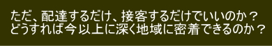 | 例として、昨年ある加盟店様は 火曜日を店休日として配送のみを実施 そうすることで、人件費の削減などコストカット・スタッフの休日など調整しやすくなるとともに、毎週火曜日に時間に余裕ができるようになり従来のお客様へ(料飲店様・法人様)訪問させていただく時間を作り、お客様へさまざまなご提案ができる時間づくりができました。 |